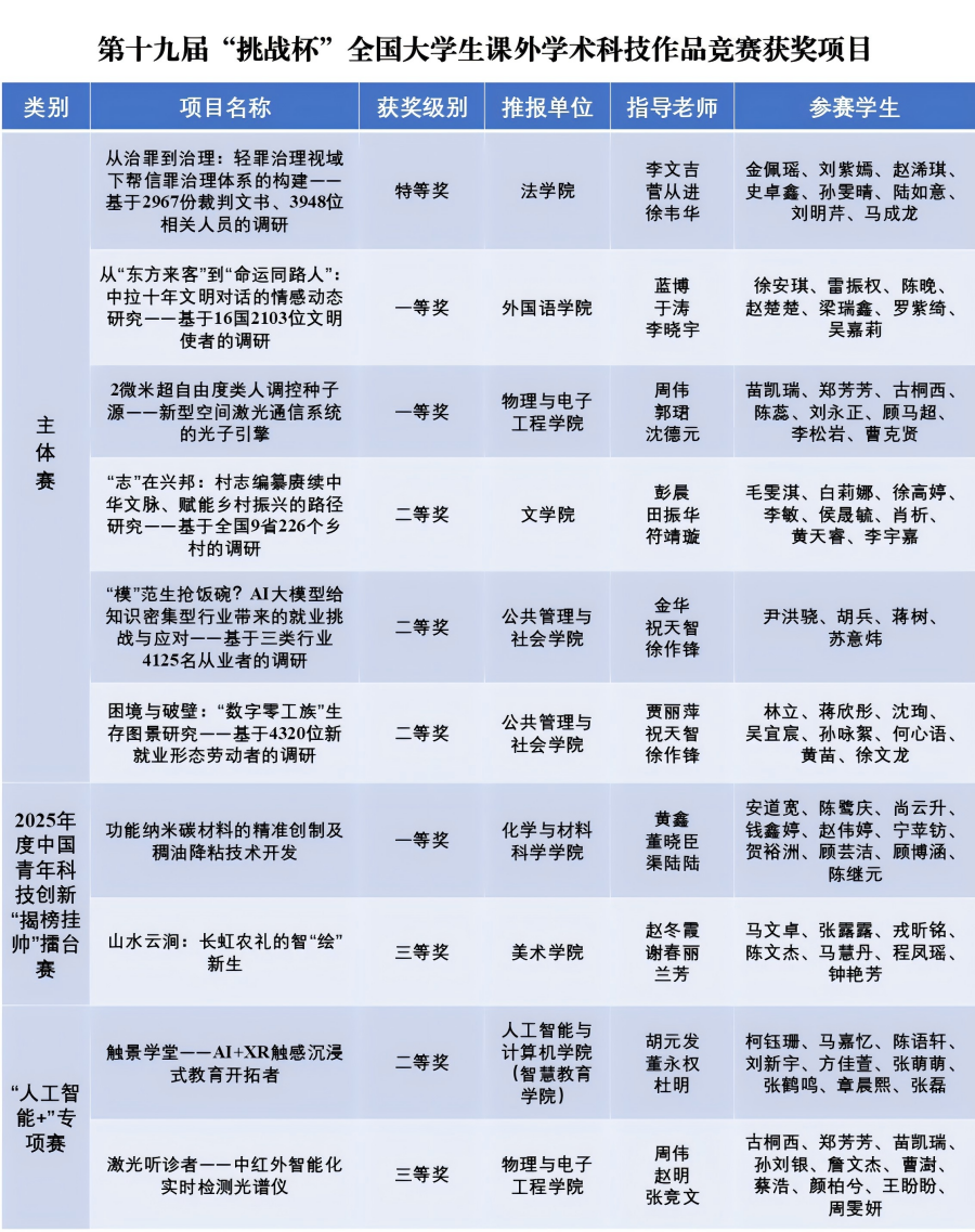 在主体赛中,我校6个项目全部通过网评入围终审决赛。法学院《从治罪到治理:轻罪治理视域下帮信罪治理体系的构建——基于2967份裁判文书、3948位相关人员的调研》荣获特等奖,外国语学院《从“东方来客”到“命运同路人”:中拉十年文明对话的情感动态研究——基于16国2103位文明使者的调研》、物理与电子工程学院《2微米超自由度类人调控种子源——新型空间激光通信系统的光子引擎》荣获一等奖,文学院《“志”在兴邦:村志编纂赓续中华文脉、赋能乡村振兴的路径研究——基于全国9省226个乡村的调研》、公共管理与社会学院《“模”范生抢饭碗?AI大模型给知识密集型行业带来的就业挑战与应对——基于三类行业4125名从业者的调研》、公共管理与社会学院《困境与破壁:“数字零工族”生存图景研究——基于4320位新就业形态劳动者的调研》荣获二等奖; 2025年度中国青年科技创新“揭榜挂帅”擂台赛中,化学与材料科学学院《功能纳米碳材料的精准创制及稠油降粘技术开发》荣获一等奖,美术学院《山水云涧:长虹农礼的智“绘”新生》荣获三等奖;“人工智能+”专项赛中,人工智能与计算机学院(智慧教育学院)《触景学堂——AI+XR触感沉浸式教育开拓者》荣获二等奖,物理与电子工程学院《激光听诊者——中红外智能化实时检测光谱仪》荣获三等奖。